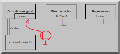 FehlerbilderDer LIN-Bus besitzt eine Ruhespannung von V-Bat, also ca. 12 V.Daher ist zu prüfen, ob ein Plusschluss oder ein schlafender Bus vorliegt. Wenn möglich, den Zustand des LIN-Bus in den Ist-Werten im Mastersteuergerät ermitteln. Ist-Wert: Bus-off bzw. Bus-on, bei Bus-on den Kabelbaum von den Steuergeräten trennen und die LIN-Leitung auf Plusschluss prüfen. Eine weitere Möglichkeit wäre, dass der Master durch einen Defekt keine Daten schickt. Dafür den Pin LIN-Bus vom Master abziehen. Bei Zündung ein, muss bei angeschlossenem Skope ein Signal zu sehen sein. Liegen weiterhin 12 V an, ist der Master vermutlich defekt.