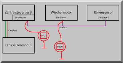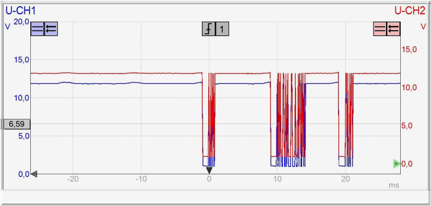FehlerbilderDurch eine Vergleichsmessung mit einem Zweikanalskope lassen sich die Datenpakete an zwei Punkten vergleichen. In dem Fall am Master und Slave 1. Verlaufen die Daten parallel, wie unten dargestellt, ist die Leitung in Ordnung und somit das Slave 1 defekt. Sind die Datenpakete unterschiedlich, liegt ein Defekt in der Datenleitung vor und muss nach Herstellerangaben instand gesetzt werden.