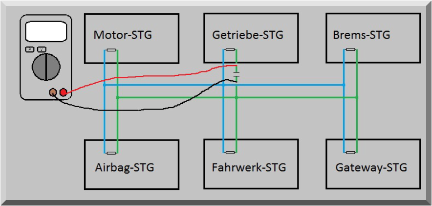 System trennen und wie im Beispiel prüfen. 0 Ohm Leitung i.O. - Steuergerät defekt oder ein großer