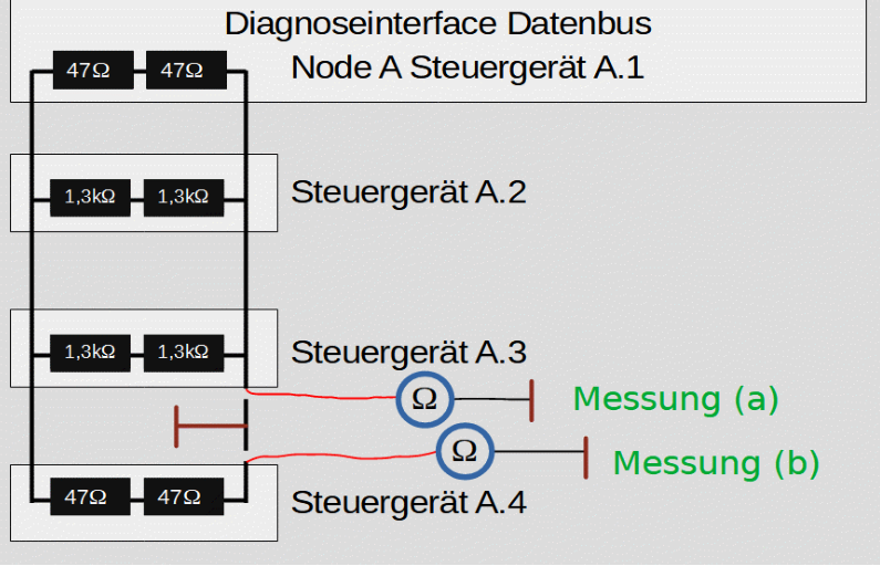 Fehlersuche am FlexRay Masseschluss - Schritt 3Schritt 3: Trennen Sie die FlexRay Leitung von Steuergerät A.3 und A.4.Messung (a) und Messung (b) zeigen, dass sich der Masseschluss im Leitungsabschnitt zwischen Steuergerät A.3 und A.4 befindet.Natürlich kann auch der Leitungsabschnitt als erstes gegen Masse geprüft werden und der Fehler somit ermittelt werden.