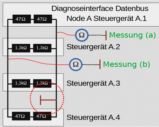 Messung (a)Ca. 0 Ohm, damit ist der Masseschluss bewiesen.Messung (b)Ca. 42 Ohm über die Abschlusswiderstände zum Masseschluss gemessen, der Masseschluss befindet sich auf der anderen FlexRay-Leitung.