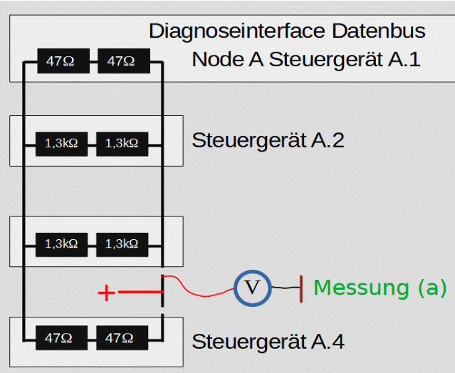Fehlersuche am FlexRay Plusschluss - Schritt 4Durch gezieltes trennen der Leitung kann der Plusschluss weiter verfolgt werden.In dem Beispiel wurde die Leitung zwischen A.3 und A.4 getrennt. Die Spannungsmessung ergibt 12 V. Damit befindet sich der Plusschluss auf der Leitung zwischen A.3 und A.4.Wäre der Plusschluss im Steuergerät, kann auchdort mit einem Multimeter eine Spannungsmessung durchgeführt werden.