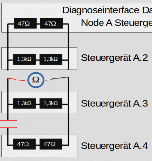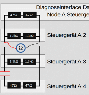Fehlersuche am FlexRay UnterbrechungUm eine Unterbrechung zu lokalisieren, können die Abschlusswiderstände herangezogen werden.Für die jeweilige Messung Zündung ausschalten, damit der Bus einschläft. Sollte der Bus mit >Zündung aus< nicht einschlafen, muss das Fahrzeug spannungsfrei geschaltet werden. Wichtig ist die BusruheAn einer gut zugänglichen Stelle wird Flex-Plus und Flex-Minus vom Steuergerät getrennt. Über Steuergerät und Kabelbaum den jeweiligen Widerstand ermittelt (siehe Bilder).