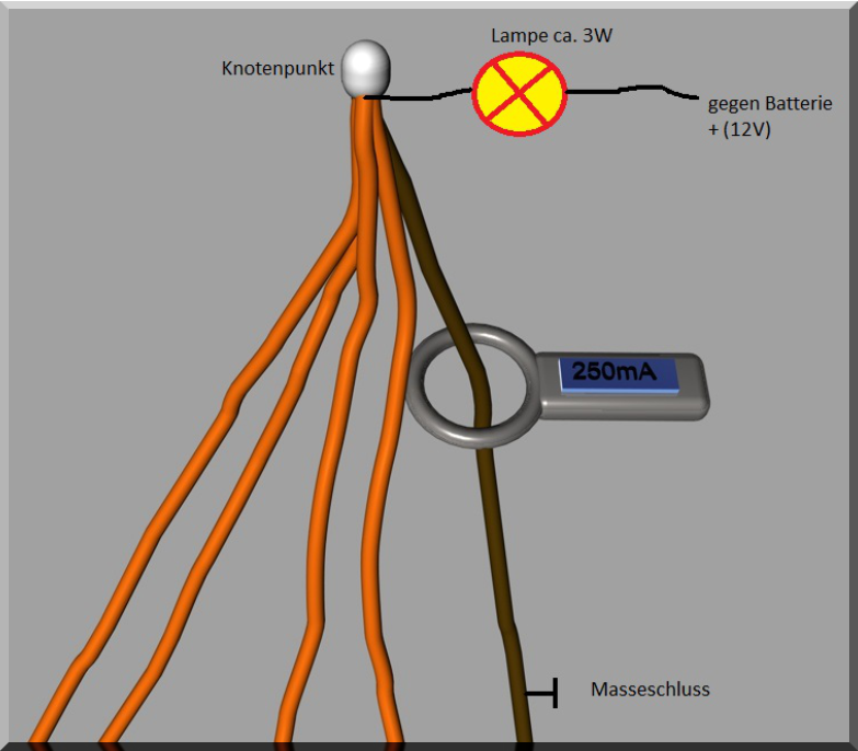 Dazu wird die Prüflampe von Batterie + (12 V) an den Knotenpunkt mit dem Masseschluss