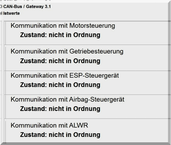 Im Fehlerspeicher, wie in den Ist-Werten, werden alle Steuergeräte als n.i.O. angezeigt.